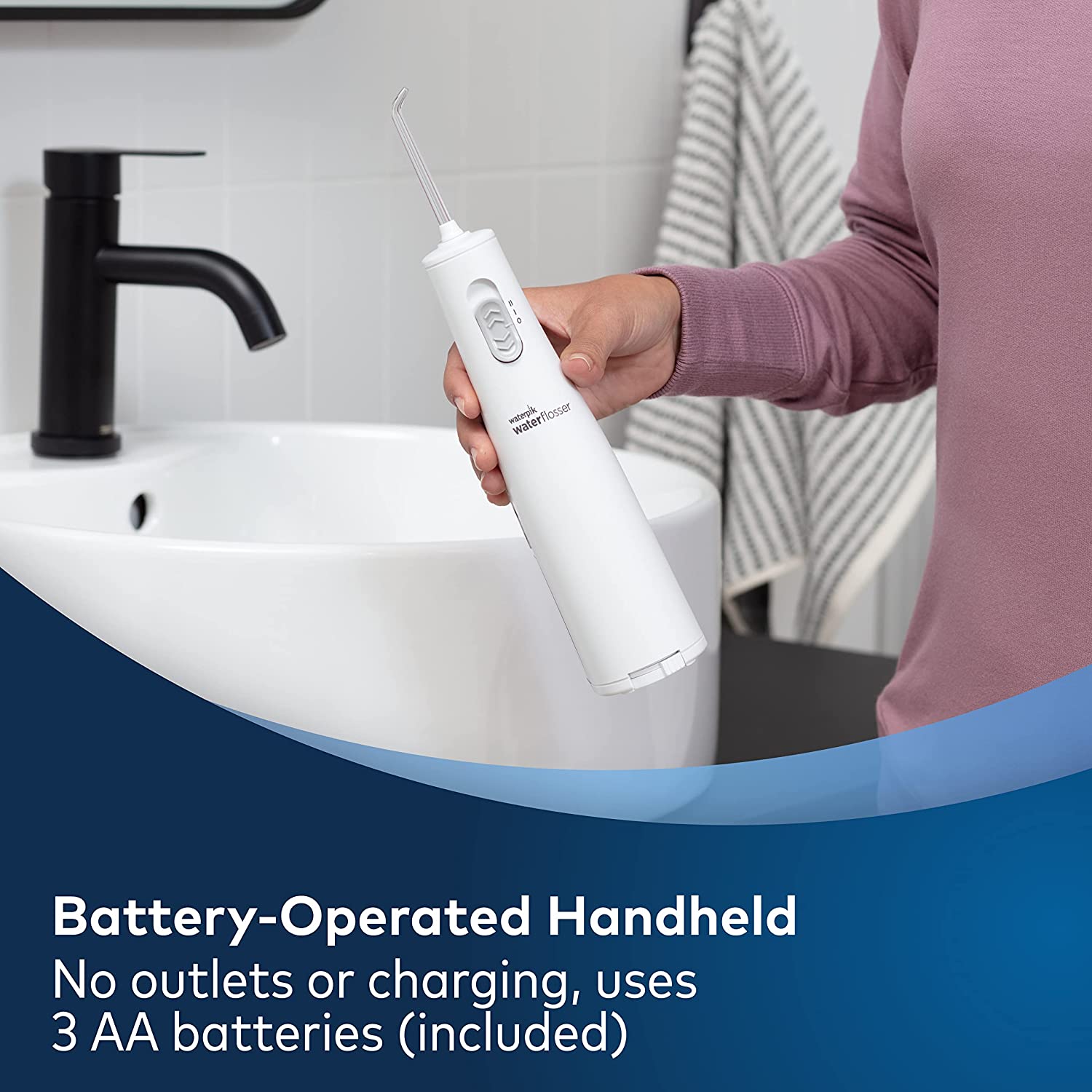 BATTERY OPERATED HANDHELD WATER FLOSSER: The Waterpik Cordless Express Water Flosser is powered by 3 AA batteries and is designed for travel anywhere, use in the shower, and small bathrooms.
