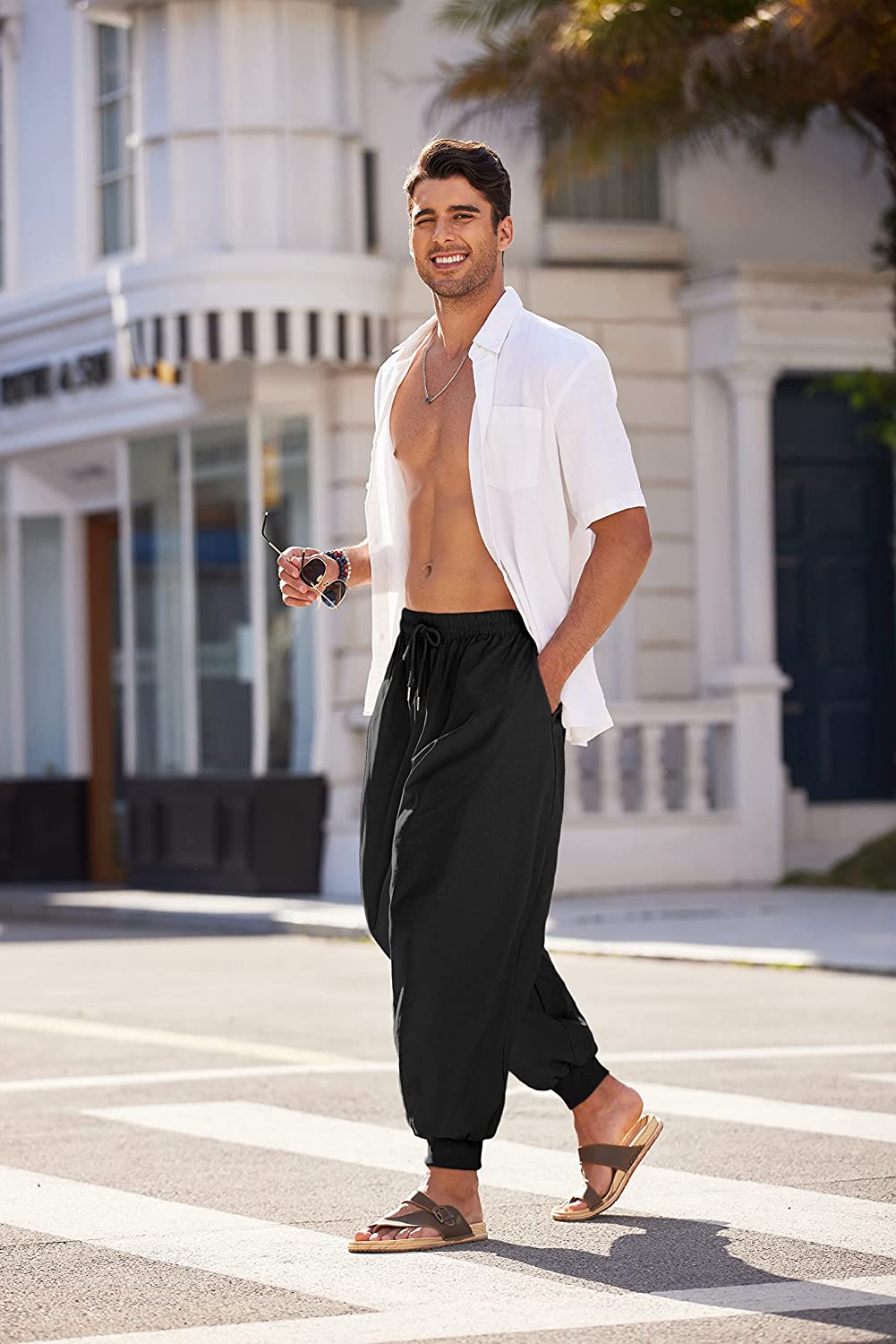 The men's baggy harem pants are made of soft cotton and linen fabric, comfortable and lightweight, skin friendly and breathable.