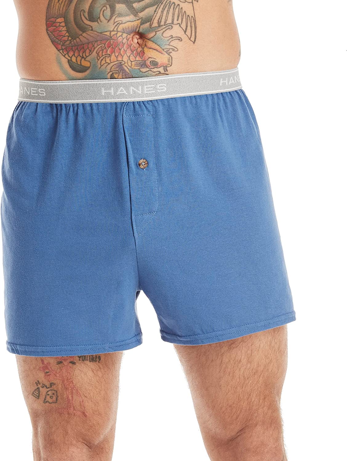 Think of everything you love about your softest tee and imagine how that would feel in ultra-comfortable cotton knit boxers. Here they are from Hanes® with comfort in every detail. Soft and breathable, these basic knit boxers are made from Cool Comfort® fabric that wicks moisture away from your skin to keep you cool and dry all day. These cotton boxers enhance comfort further with the ComfortFlex® stretch logo waistband that moves with you and keeps its shape wash after wash without pinching or binding. Another detail of comfort designed into Hanes® T-shirt-soft knit underwear is the tagless styling which means no annoying tag to bunch up or itch. You'll also appreciate the button fly that stays smooth and the convenience of a 5-pack for stock-up ease.