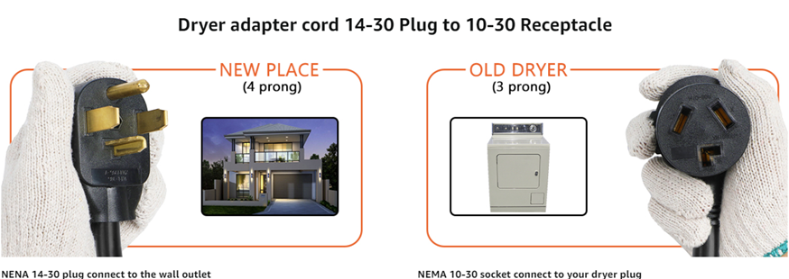 - 【Adapter for 240-Volt Electric Clothes Dryers】 30AMP (14-30P) male plug to 30AMP (10-30R) female outlet.Converts 3 prong dryer to fit a 4 slot wall dryer outlet when you moving into a new home, house or apartment.