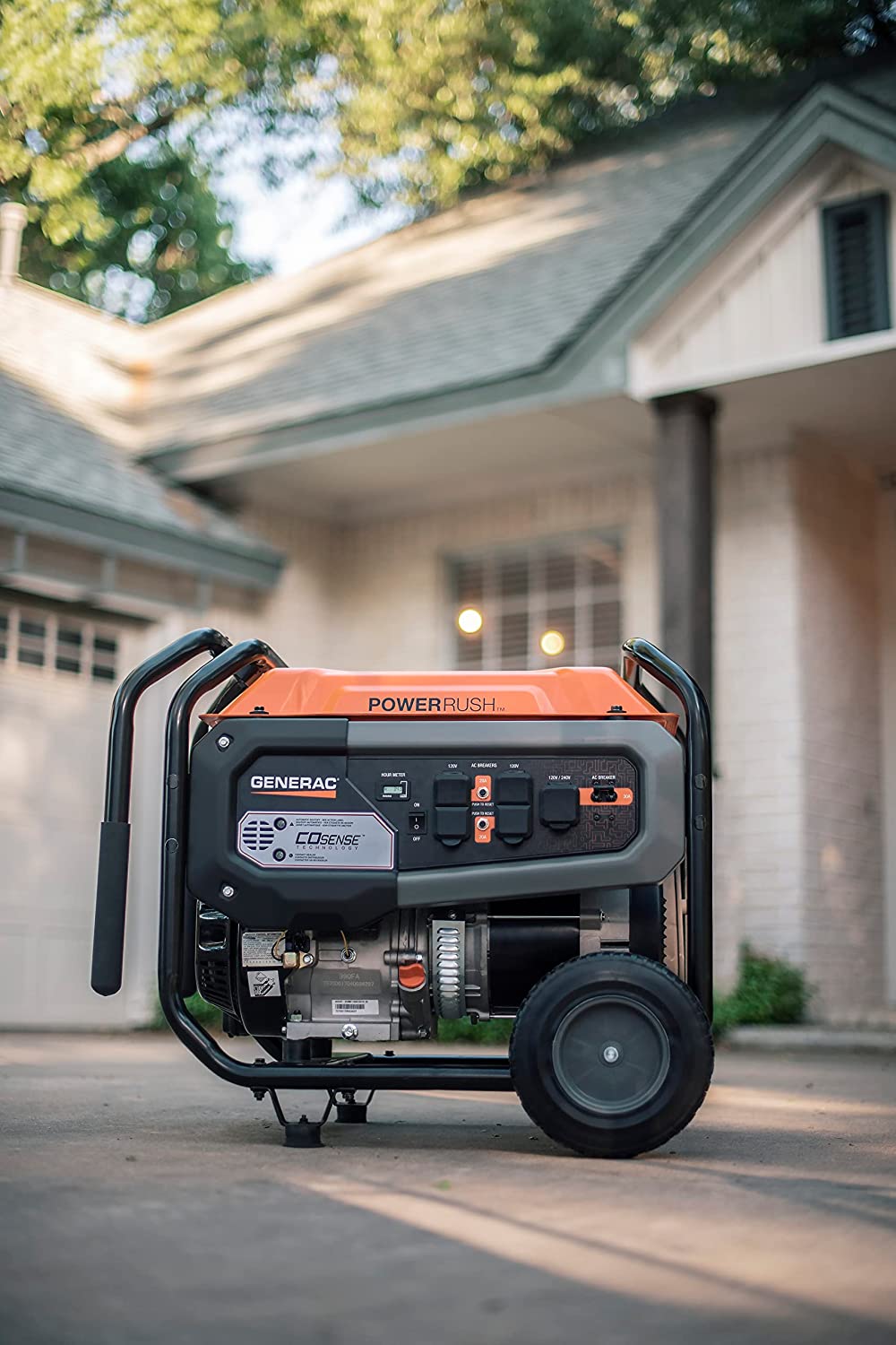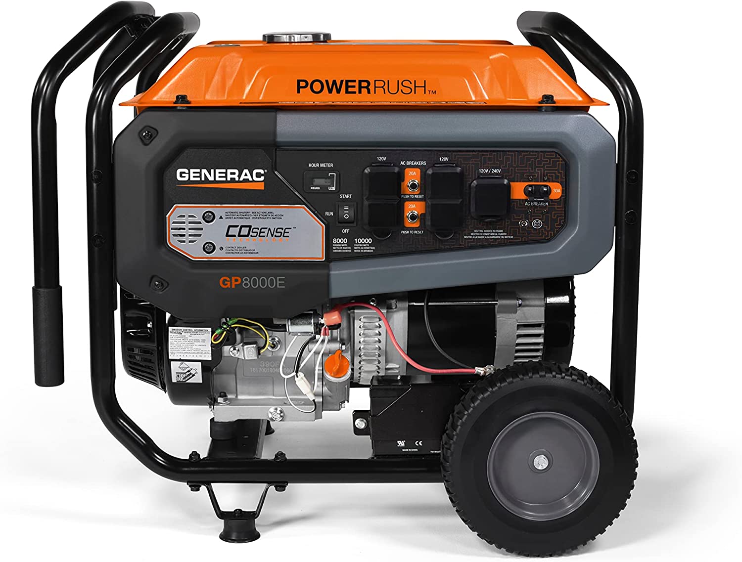 Generac’s GP8000E offers many benefits that make this model a favorite for emergency power or recreational use. Power Rush Advanced technology delivers over 30% more starting capacity* (*increase electrical current upon demand above rated output when starting electric motors), and electric start makes the GP8000E easy to use (battery included). You’ll always be prepared with the plug-in battery jack that keeps the battery charged and ready for unexpected outages. The long-lasting OHV engine and large-capacity steel fuel tank with fuel gauge provide increased durability and up to an 11-hour runtime at 50% load. Rough or rugged environments will not be an issue thanks to the covered outlets for added protection, heavy-duty wheels that will never go flat and a fold-down handle that will enable you to easily transport your generator to any location. The low-oil feature will automatically shut down the generator, preventing damage to the unit, while the hardened 1. 25-in. Steel-tube cradle increases strength and resilience. And with the regular maintenance alerts provided by your hour meter, you’ll never be caught off guard.