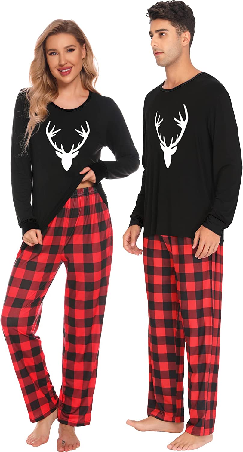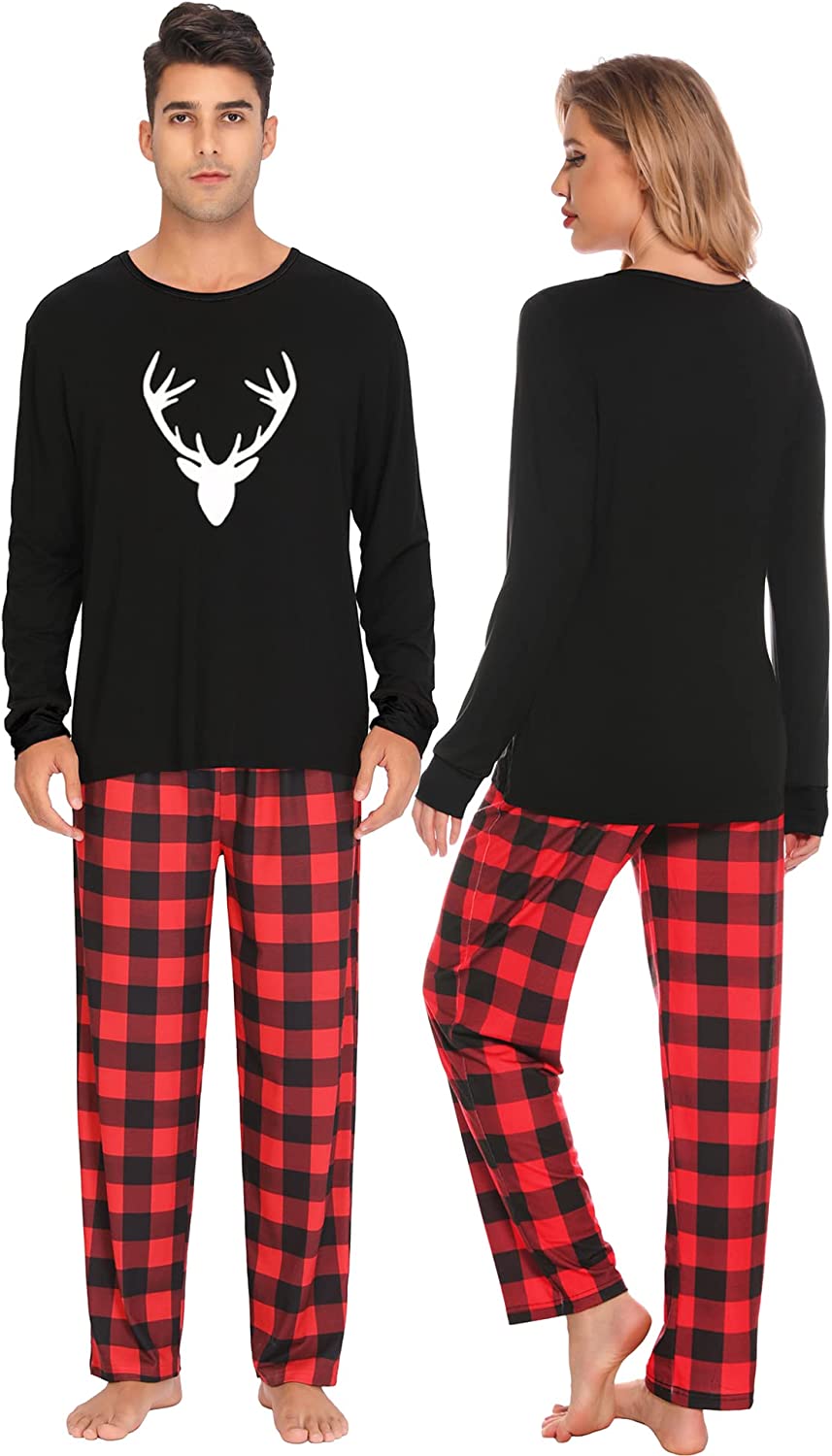 SWOMOG Matching Couple Pajamas Set Xmas Printed Pajamas Soft Loungewear Sleepwear Plaid Pants