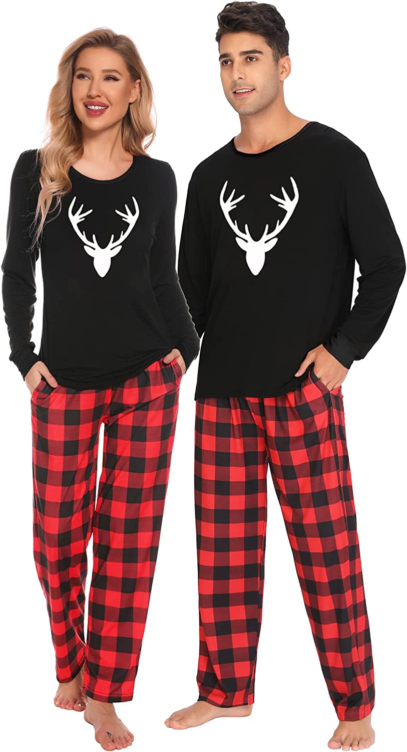 SWOMOG Couple Pajamas Set Christmas Matching Pjs Long Sleeve Set Xmas Printed Pajamas for Men&Women Plaid Pants with Pockets