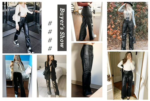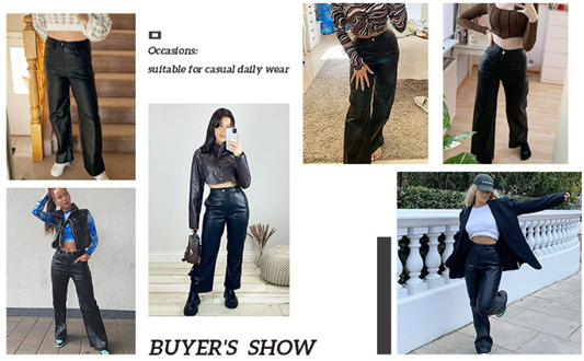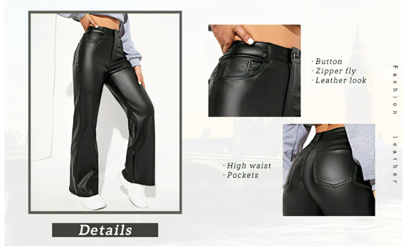 Feature: high waist, button, zipper fly, leather look, pockets, solid color, casual straight leg jeans for women