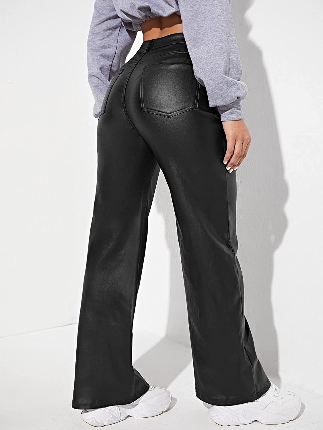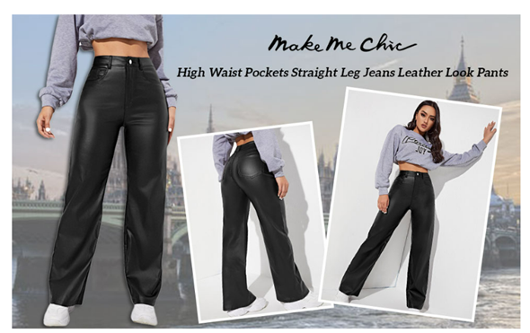 MakeMeChic Women's High Waist Pockets Straight Leg Jeans Leather Look Pants