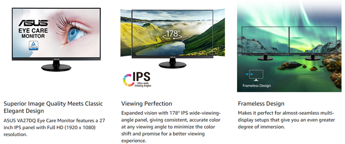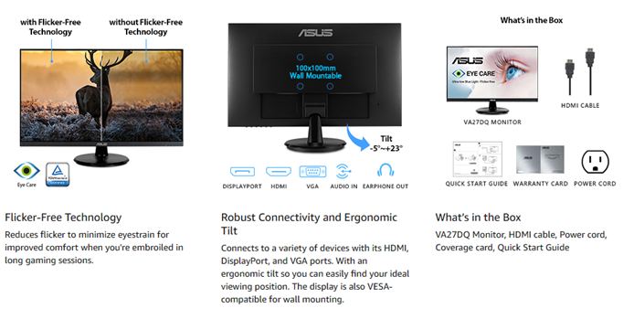 ASUS 27” 1080P Monitor (VA27DQ) - Full HD, IPS, 75Hz, Speakers, Adaptive-sync/FreeSync?, Low Blue Light, Flicker Free, VESA Mountable, Frameless, HDMI, VGA, DisplayPort, Tilt Adjustable, BLACK