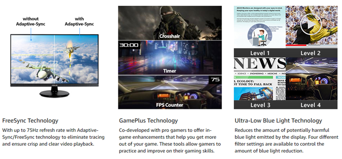 • Up to 75Hz refresh rate with Adaptive-Sync/FreeSync technology to eliminate tracing and ensure crisp and clear video playback