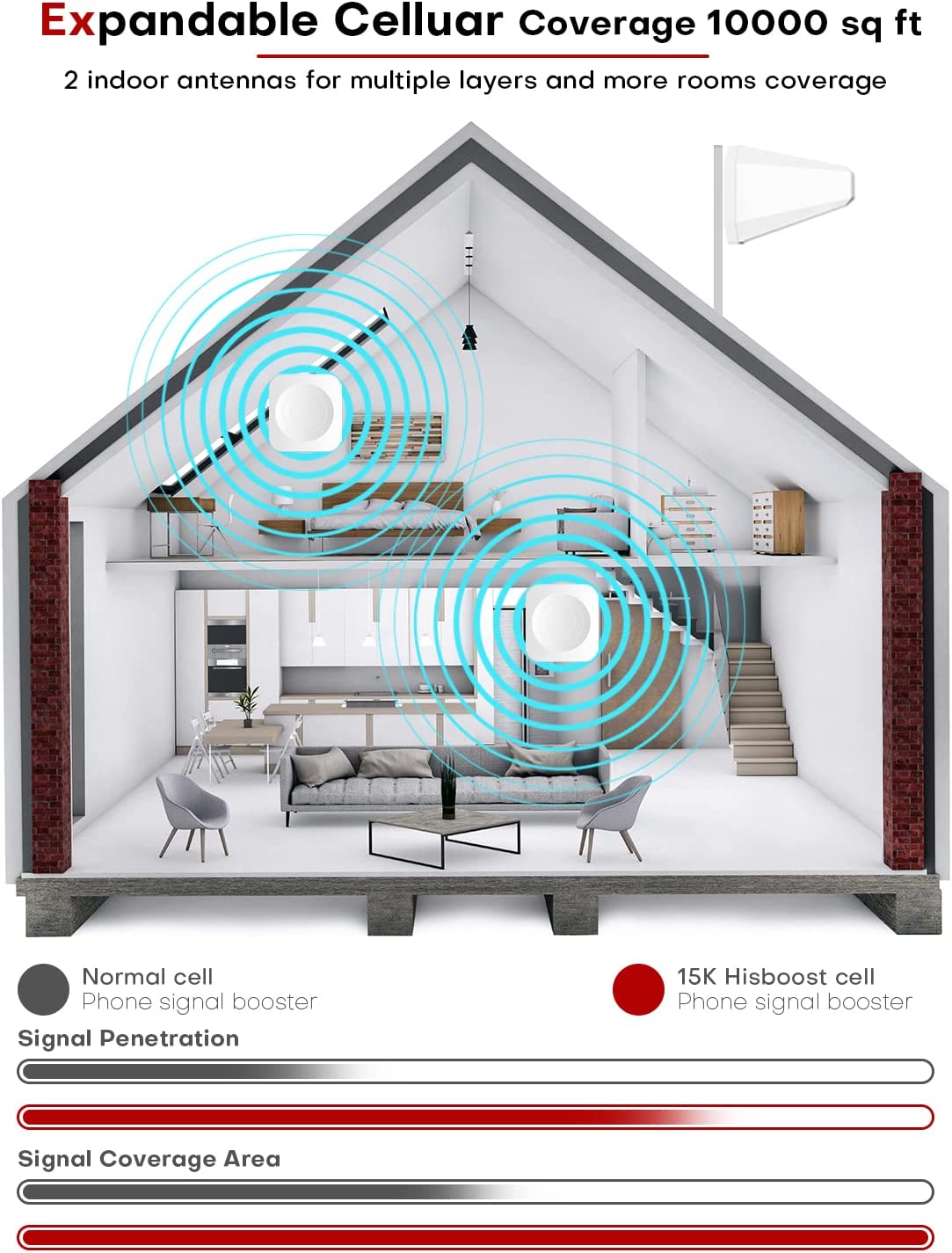 【???? ????? ??????? ??? ????】HiBoost cell phone signal booster supports a cellular signal reception up to 5500 square feet (3-4 rooms). Max gain to 65dB, providing you with better indoor cell phone signal reception, reducing dropped calls, and improving voice and data signals, ideal for your home, office, village, cabin, garage, hotel, apartment, farm, warehouse, etc.! You do not need to install the additional indoor antenna.