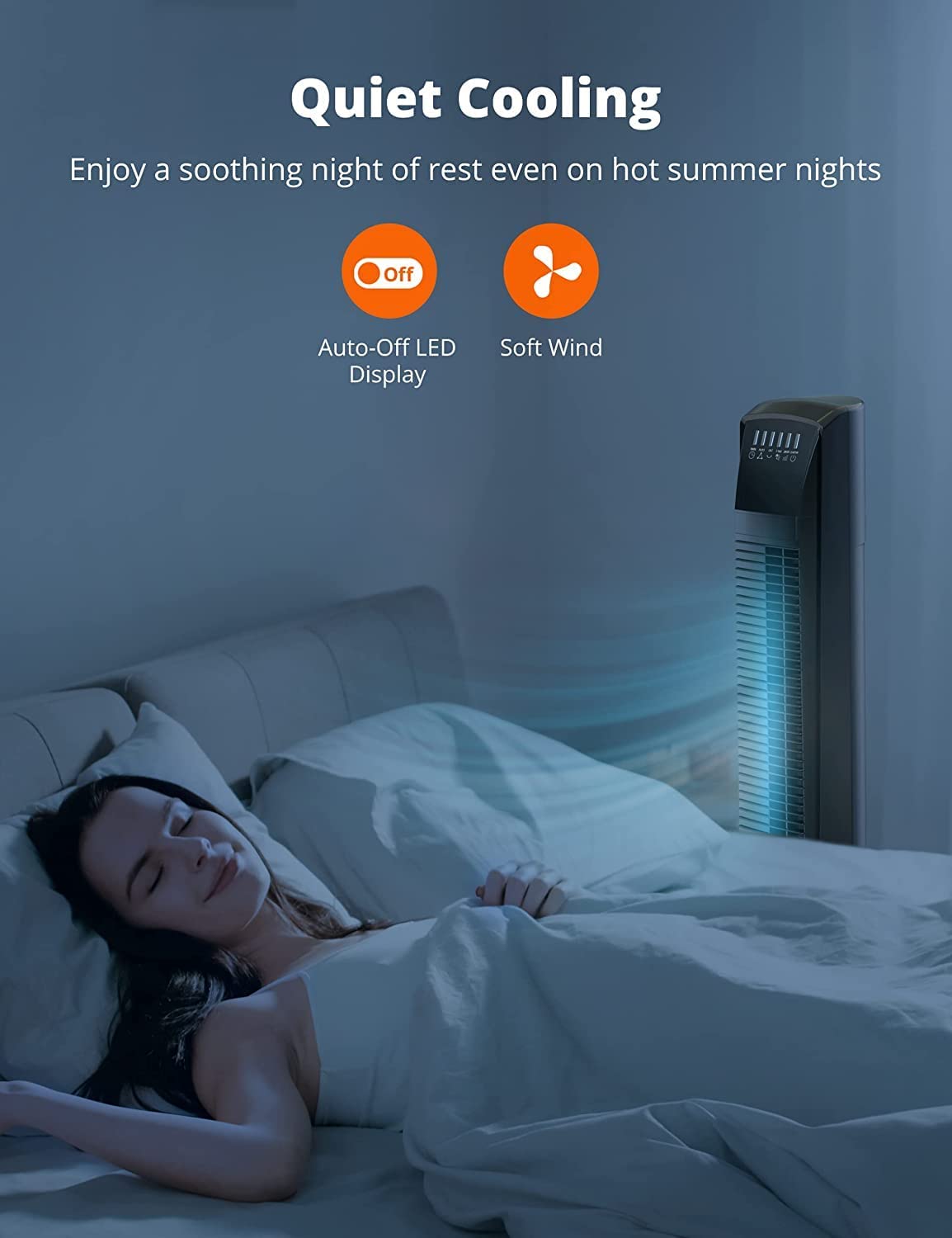 - 65° Oscillation For Wider Air Distribution: Coming with a 65° oscillation feature, the tower fan is able to offer a wider airflow and increase its cooling effects, so it can provide a refreshing experience to your entire family. For even better results and less energy waste, you can pair your fan with your air conditioner to accelerate the air ventilation and attain a more balanced room temperature.