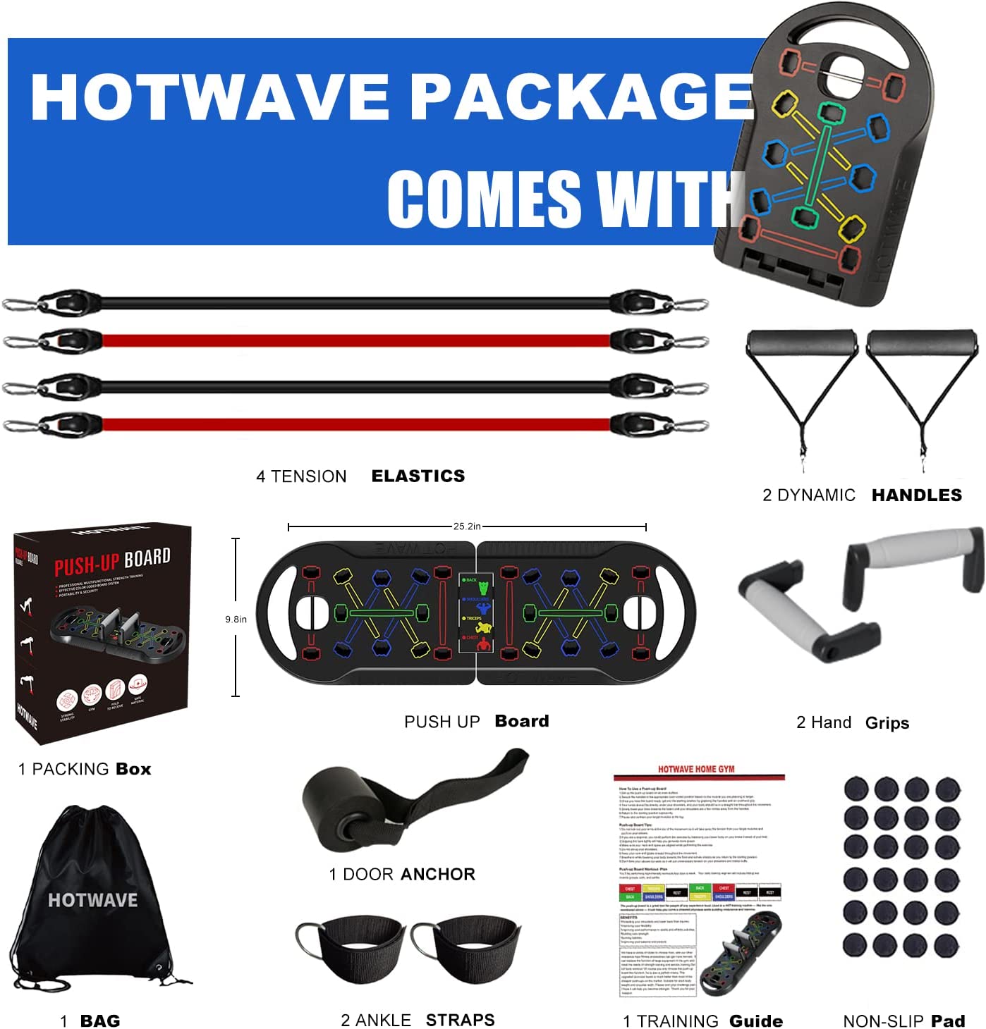 - 【LIGTH AND PORTABLE】The Hotwave board is lightweight, but very strong and safe,It made of ABS Ductile plastic that with strong toughness. The resistance bands have great elasticity. The non-slip push up handles provide a firm grip and distribute pressure evenly to reduce joint pressure. There are also added non-slip plugs to help stabilize your body while exercise.