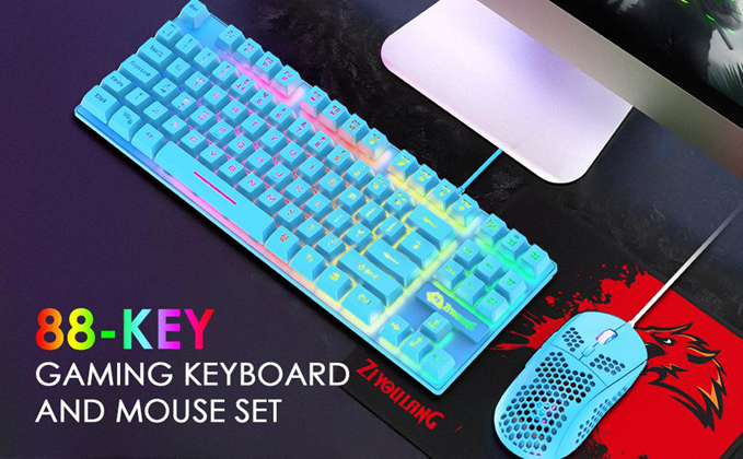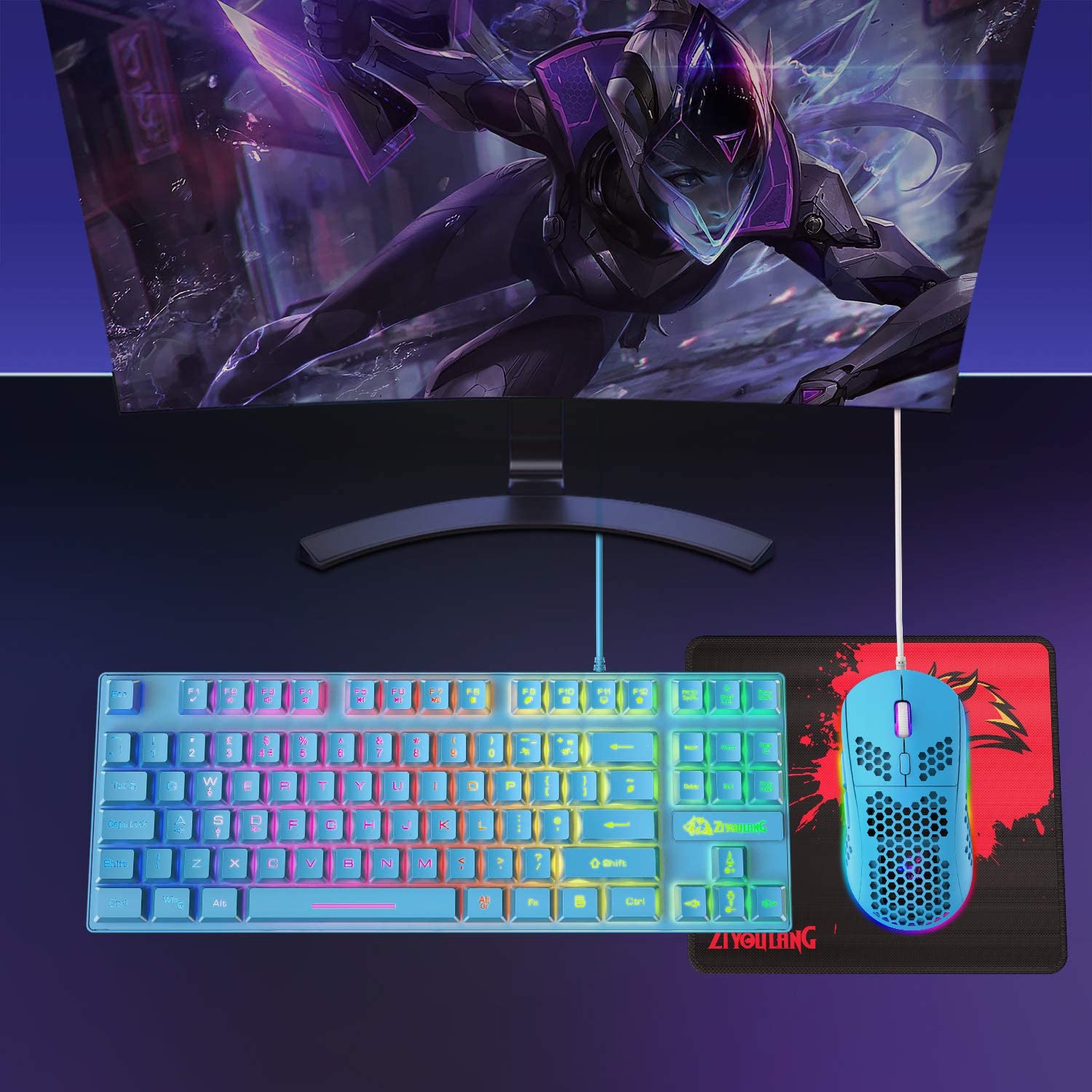 Gaming Keyboard and Mouse Combo,88 Keys Compact Rainbow Backlit Mechanical Feel Keyboard,RGB Backlit 6400 DPI Lightweight Gaming Mouse with Honeycomb Shell for Windows PC Gamers (Blue)