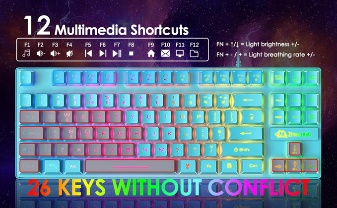 • 【88 Key Mechanical Feel Gaming Keyboard】26 conflict-free keys for ultimate Gaming performance. Featuring 12 Multimedia keys, Non-Slip Ergonomic, splash-proof Design with adjustable rear feet for the perfect typing angle, High-Speed USB cable with gold-plated corrosion free USB connector for a reliable connection which will stand up to fast hardcore gaming