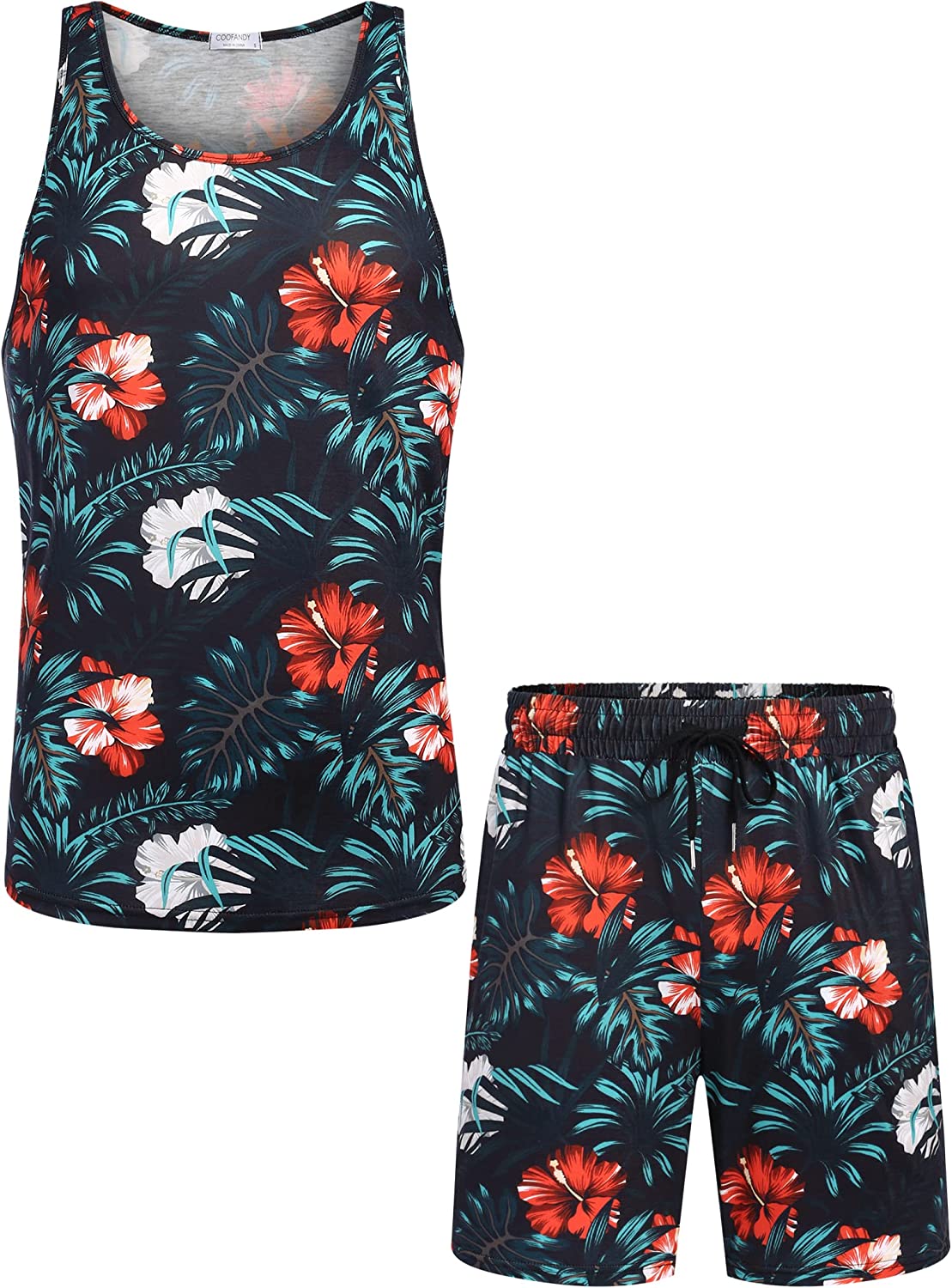 - Summer Tank Tops Beach Shorts Sets --- Men's hawaiian tank top with loose fit, sleeveless, racer back; Beach Shorts with two slanted side pockets, elastic waist drawstring. Simple and fashion matching of tank top and shorts suits, you deserve it in the hot summer.