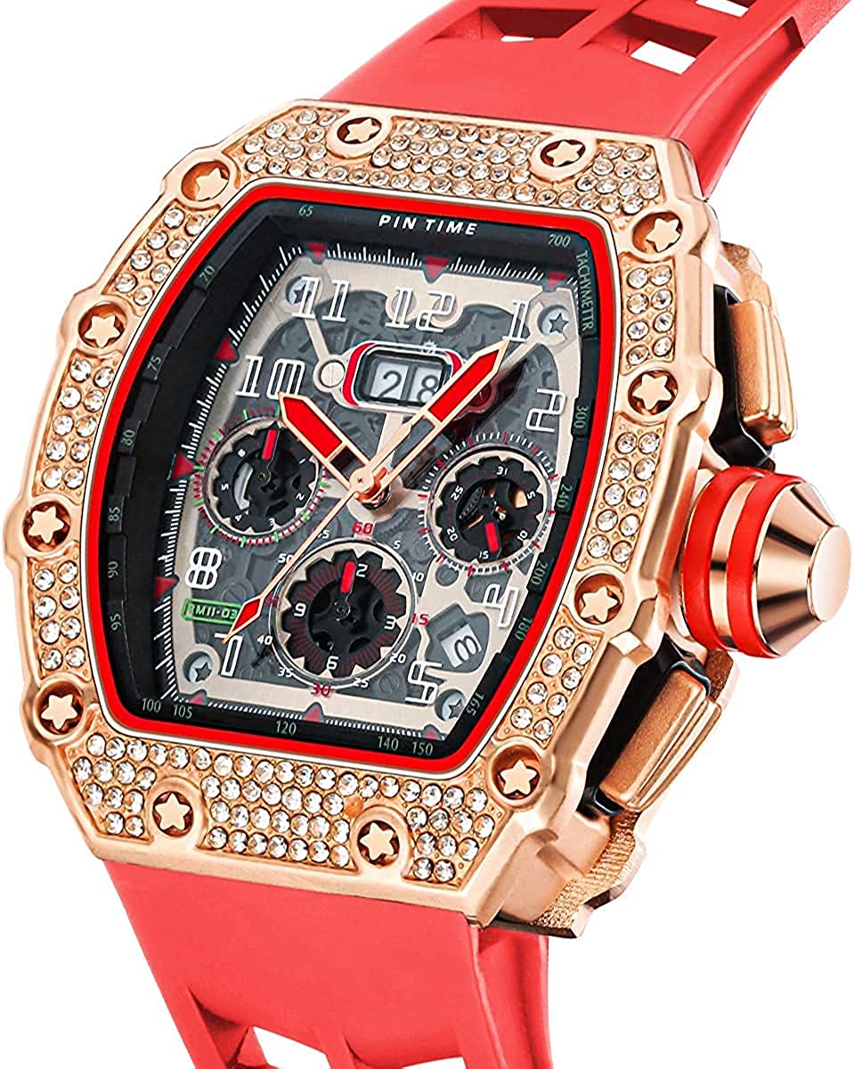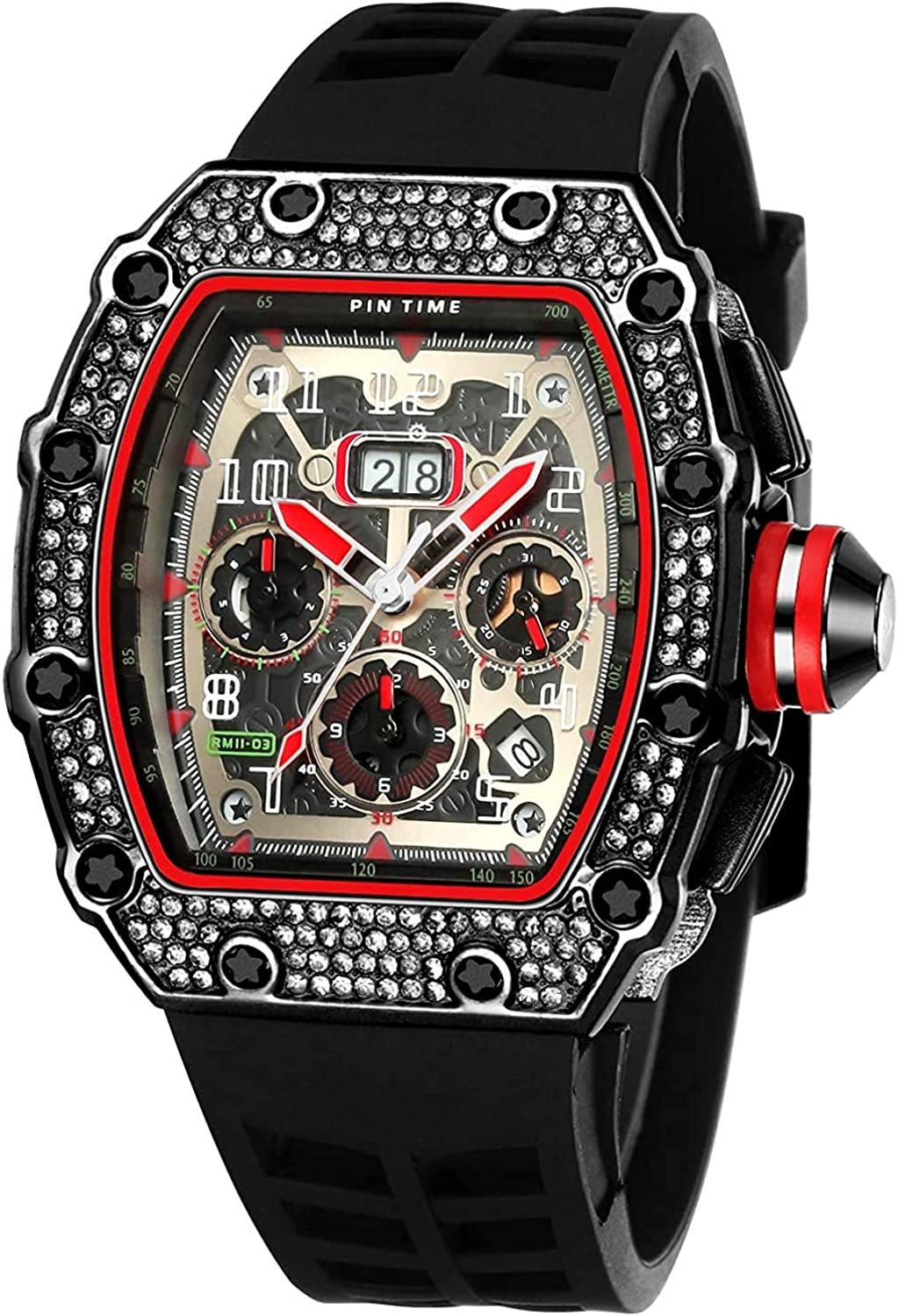 Gosasa Mens Diamond Watches Luxury Tonneau Watches for Men Analog Watch Chronograph Calendar Date Men’s Dress Business Work Watch Large Rectangle Face Wristwatch with Silicon Strap