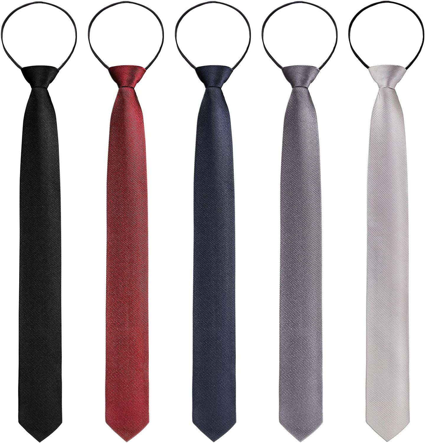 Xinnun 5 Pieces Mens Zipper Ties Pre Tied Adjustable Neckties Solid Color Skinny Necktie Thin Clip on Slim Tie for Office School Wedding Party Uniforms, Black, Navy, Gray, Silver Gray, Dark Red