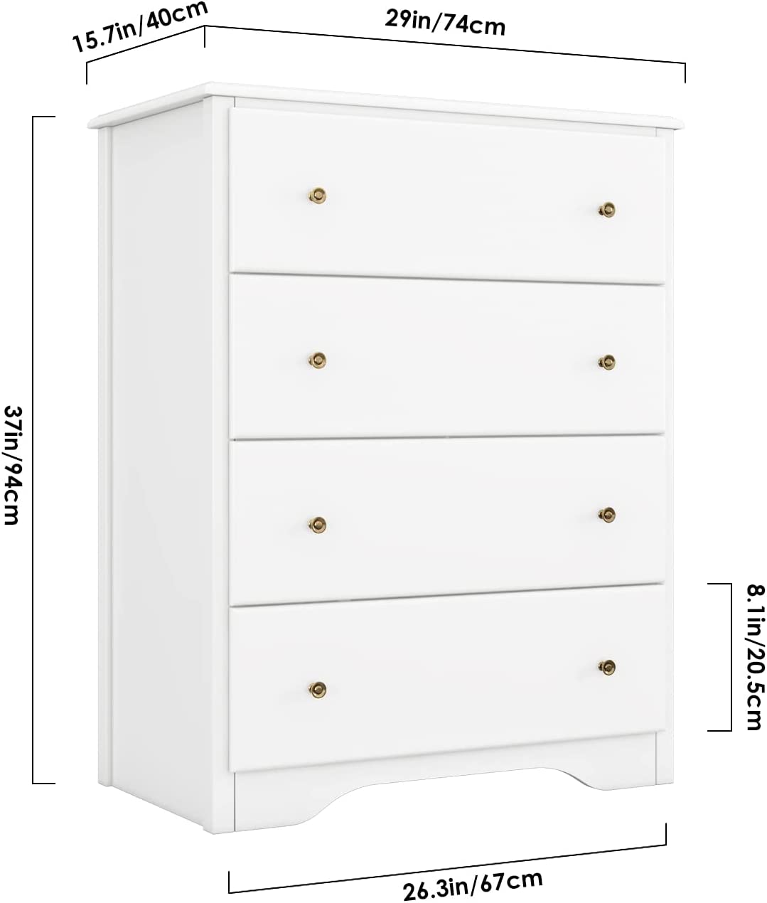 Ample Storage Space - Maximize storage when you bring home this unique chest of drawers. 4 wide drawers can organize anything from shirts, socks and hats to diaper and toys, this wood dresser will meet all your storage needs