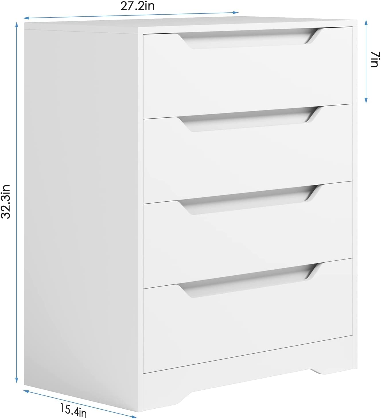 STURDY STRUCTURE: Consisting of premium MDF wood and quality hardware, this modern 4 drawer dresser features superior sturdiness and long lasting durability. Each drawer holds up to 25 lbs. Overall measurements: 15.4” D x 27.2” W x 32.3” H