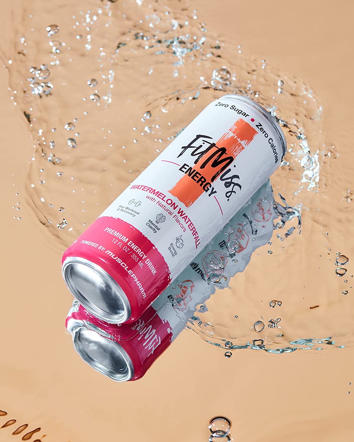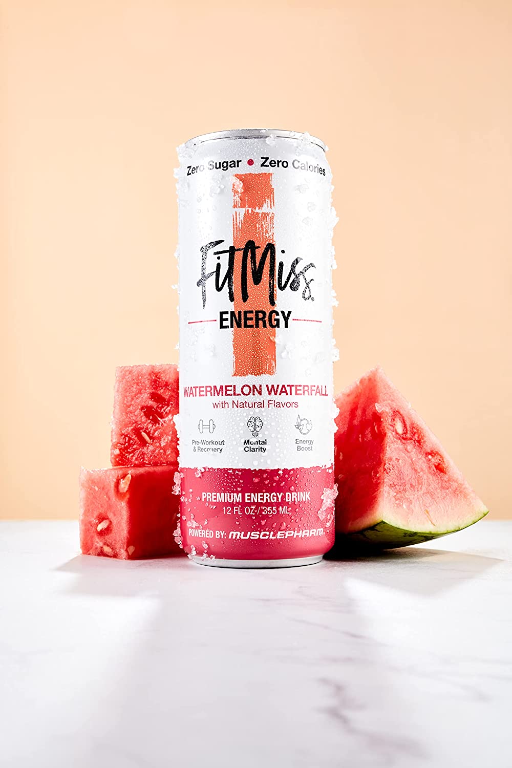 usclePharm FitMiss Energy Drink 12oz (Pack of 12) - Watermelon Waterfall - Sugar Free Calories Free - Perfectly Carbonated with No Artificial Colors or Dyes