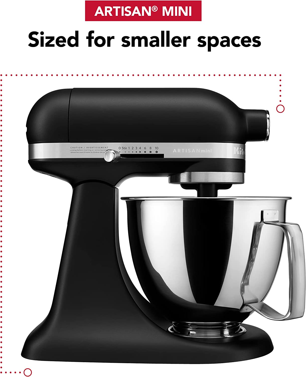 Lighter. Smaller. Just as Powerful.* When you still need the power but don't quite have the space, the KitchenAid® Artisan® Mini Tilt-Head Stand Mixer can whip up the recipes you love without taking over your kitchen counter. This durable tilt-head stand mixer was built to last, and can mix up to 5 dozen** cookies in a single batch. It features 10 speeds to gently knead, thoroughly mix and whip ingredients for a wide variety of recipes. Whether you're craving fresh guacamole, gently shredded pulled pork or a single, flavorful pan of meatloaf, the Artisan Mini can help you create a variety of small-batch, hand-crafted possibilities. Get creative and make more with your mixer with over 10 optional hub-powered attachments***, from food grinders to pasta makers and more. *Compared with the KitchenAid® Classic™ Stand Mixer. **Using the flat beater; 28g dough each ***sold separately.