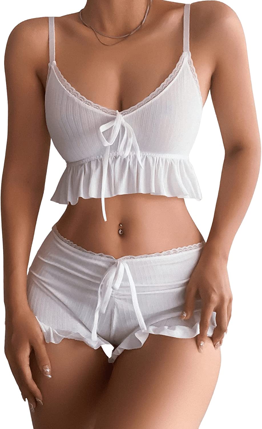 SweatyRocks Women's 2 Piece Lingerie Set Ruffle Trim Tie Front Cami Top and Shorts Sleepwear