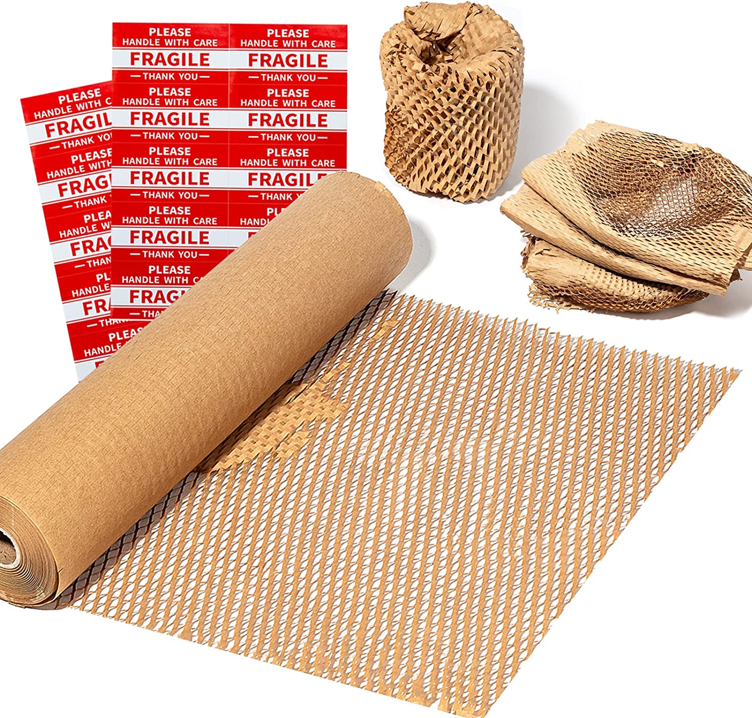 Honeycomb Packing Paper Size: 15 inch x 135 feet. Comes with 20 fragile sticker labels. Made of 54 lbs recyclable kraft paper. How it works: Strenthed honeycomb structure can get a protective padding, makes a better cushioning performance. Protect your items from breaking, such as dishes, glasses, crafts, frame, pictures, china, plates and cups, etc. Great for moving, shipping or wrapping breakables and delicate Items.