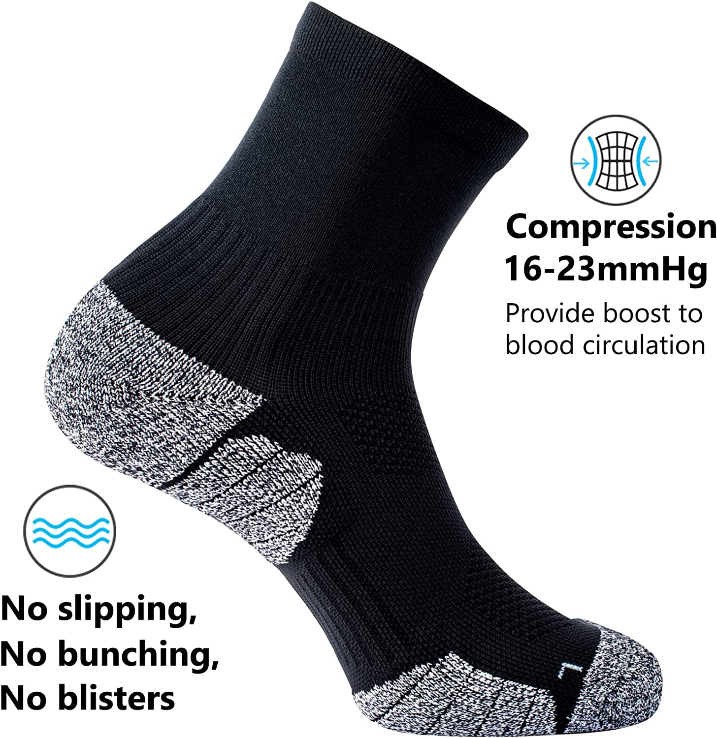 COMPRESSION FIT: Sport socks with targeted compression (16-23 mmHg) to provide boost to your blood circulation, anti-swelling, arch support, fit your feet perfectly and no slipping, no bunching, no blisters