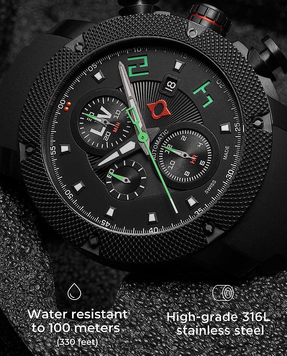 LIV GX-AC Swiss Automatic ETA 7750 26 Jewel Movement Chronograph 46mm 316L Case, 3D Multi-Layer Dial + Quickset Date - Rugged Classic Watch for Men - Skeleton Case-back - Sapphire Crystal - 330 FT Wat