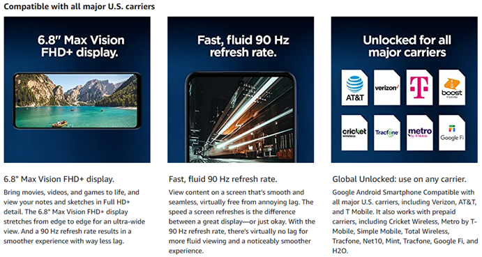 - Carrier compatibility: AT&T: VoLTE, Verizon: VoLTE, T Mobile: VoLTE, WiFi Calling, Video Calling, Tracfone: GSM, CDMA Does not support:Boost, U.S. Cellular, Xfinity Wireless, Spectrum, Optimum Mobile. For all carrier compatibility details - please check the product images in detail.Maximum display resolution:1080x2460 .Display Type:IPS.Form_factor : smartphone.Display resolution maximum:1080x2460.Other camera description:Front,Rear