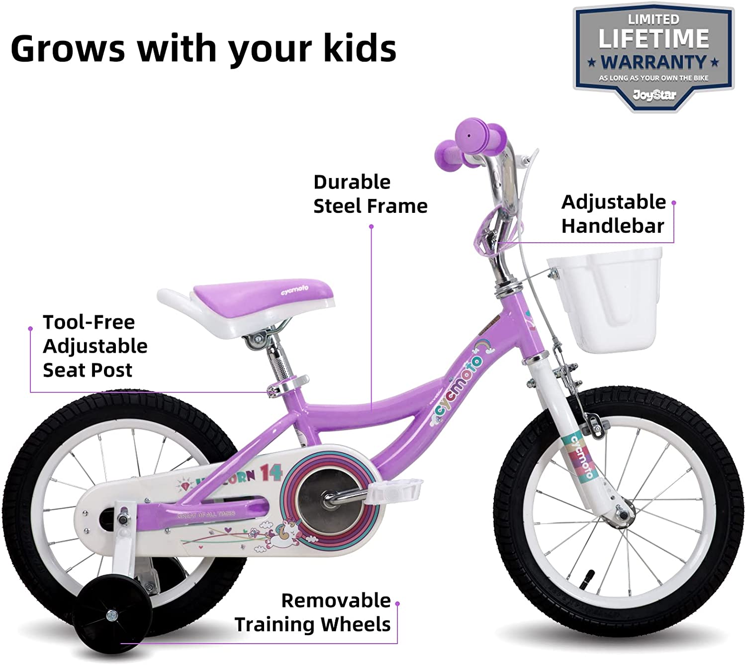 - Grow with Your Child - The adjustable saddle and handlebar, seat post, and slack seat-tube angle make for easy, tool-free adjustments to allow the JOYSTAR Fairy girl's bike to grow with your child and prepare them for a full-sized bicycle. The training wheels can be removed when they are ready to ride independently.