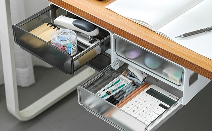 - 【STRONG SELF-ADHESIVE DRAWER】 The hidden drawer under desk can apply to various occasions such as office,kitchen, living room, bedroom, study rooms, dressing rooms. Due to the transparent plastic, it’s easy to access whatever you need at a glance. Help to organize your desk and save space. Convenient to clean it as well.