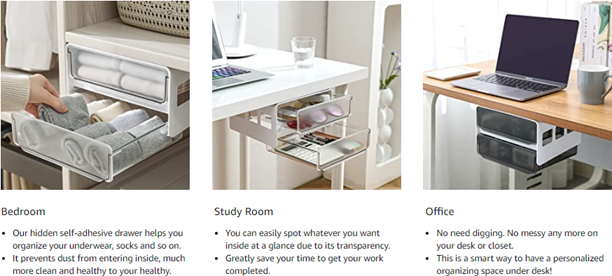 | Special Features | Under Mounted Drawer, Under Desk Drawer with Two Layers, Self-Adhesive, Hidden Drawer Under Table, Under Desk Drawer Slide-out |