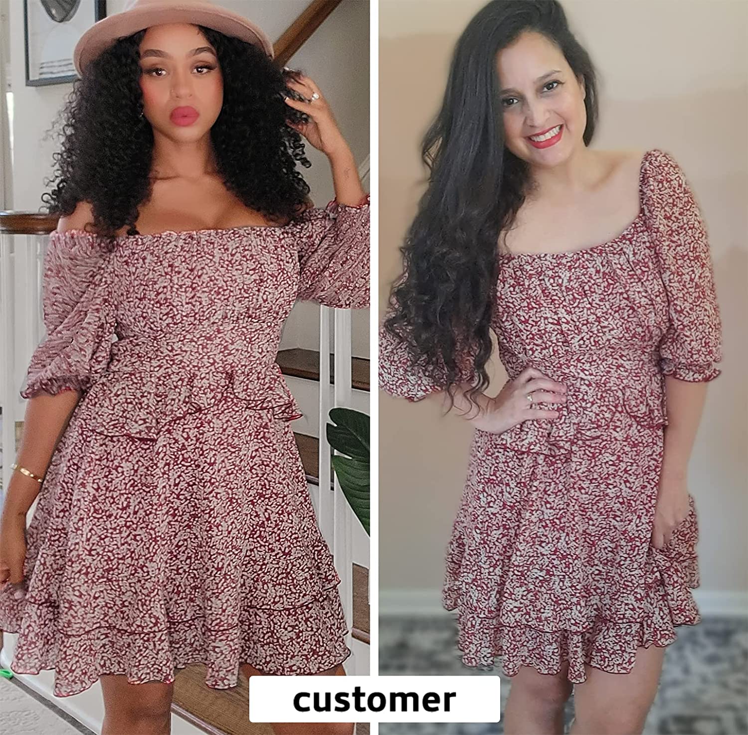 Design: 2022 summer dress for women, square neck, off shoulder, ruffle hem, 3/4 puff sleeve, mini length, tiered design, lining, floral print dress, smocked design, open back, frill hem, ruched bust, high waist, a-line silhouette.