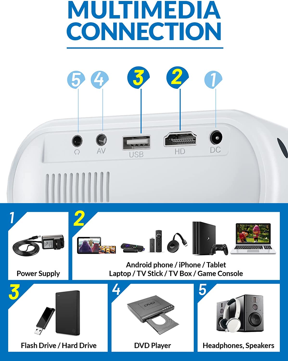 【2023 Upgrade Mini Projector】 Mini projector has 9000 Lux brightness and supports 1080P Full HD 30-180(Recommended for 60 -100 inches) inch display, adopting advanced LED technology and uniform illumination method, which make the edges of the projection brighter and clearer. These ensure the projection image quality presents a real, dynamic, and color-vibrant effect. The mini projector also applied diffuse reflection technology, protect your eyes away from tiredness.