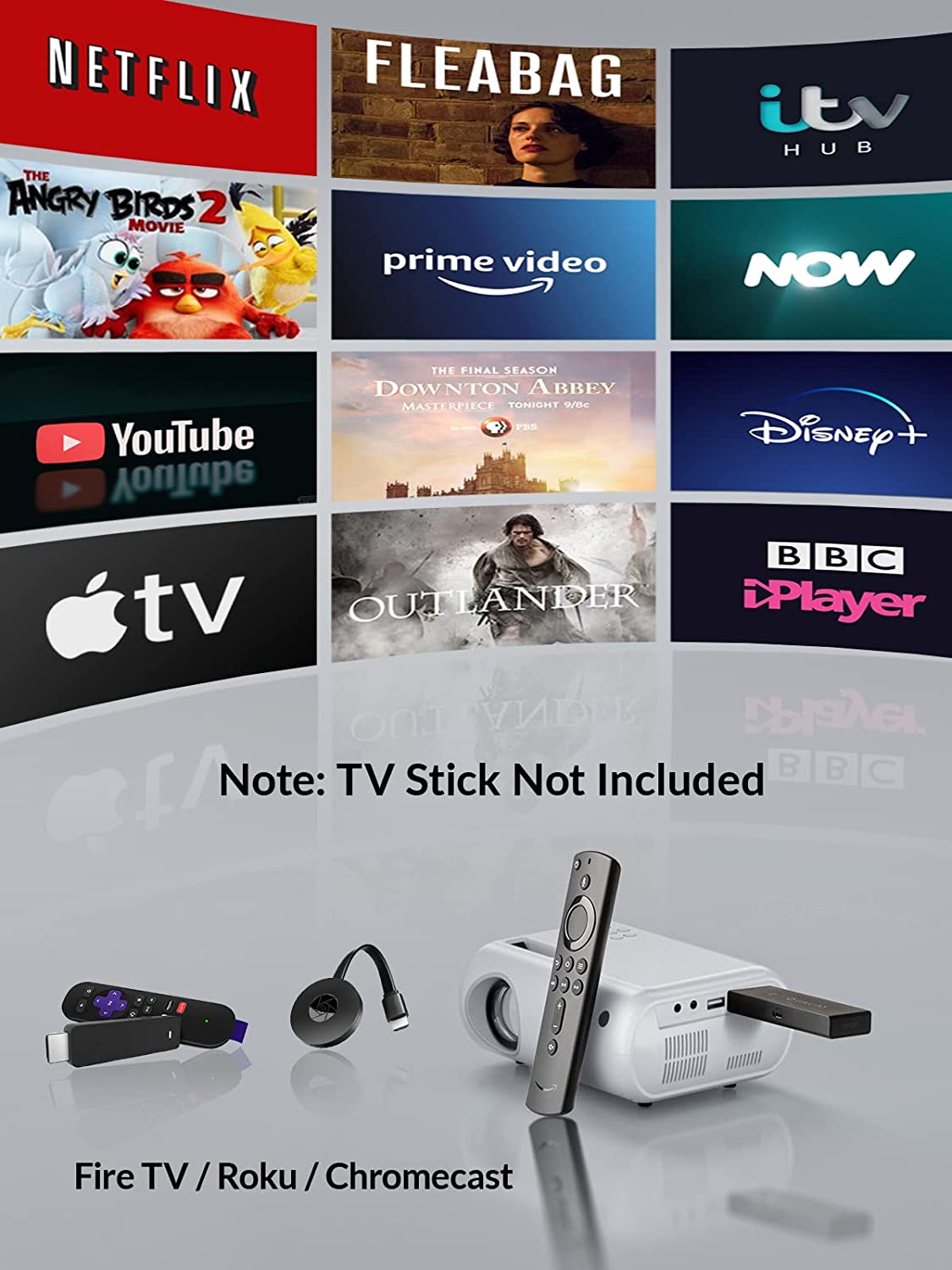 【Multiple Devices Connection & Wide Application】 Equipped with HDMI, USB, and AV interfaces, the movie projector works perfectly with iPhone/Android Phone, Tablet/iPad, Laptop, Macbook, Blu-ray Player, TV boxes, DVD players, PS4, USB flash disks, etc. It can be applied to home theaters, video games, parties, and outdoor activities. ☛( Note: Due to HDCP copyright, this projector doesn't support Netflix, Amazon Prime, and Hulu, but you could use Amazon Fire Stick or Roku Stick.)