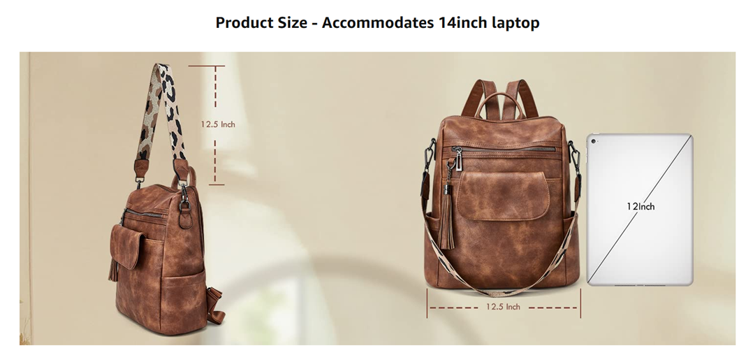 【DIMENSION】 Backpack: (L) 12.50 x (W) 6 x (H) 13 inches. Wristlet: (L) 8.75 x (H) 6 inches. Adjustable back straps: 35.55"(longest size). Detachable shoulder strap: 12.50". You can easily fit a 14-inch laptop, office papers, cell phones, water bottles, clothes and your daily items into this women's backpack purse.