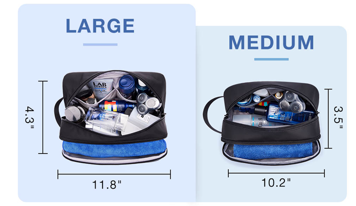 Roomy Capacity Toiletry Bag- Dimension: 10.2 x 3.5 x 6.3 inches. 1 capacious main compartment to hold all your toiletries and shaving supplies organized. There are 2 small mesh pockets inside the main compartment for small items. 1 water-resistant outer handy pocket of this mens dopp kit for toothbrushes and towels to separate wet and dry.