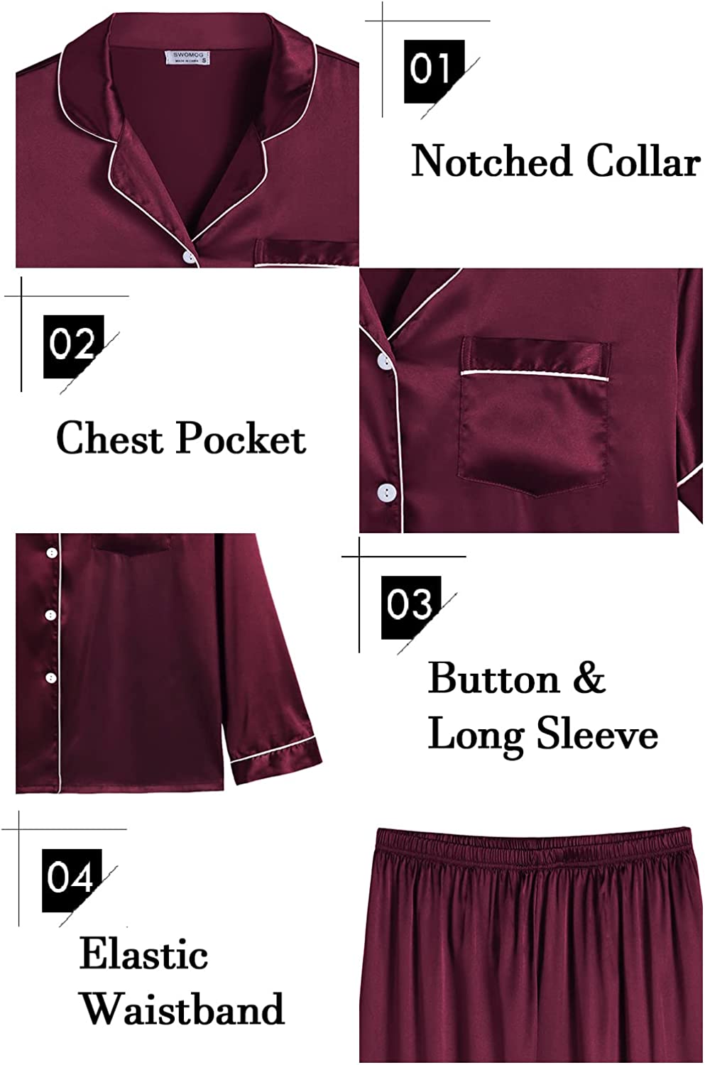 SWOMOG Womens Silk Satin Pajamas Set Long Sleeve Loungewear Two-piece Sleepwear Button-Down Pj Set