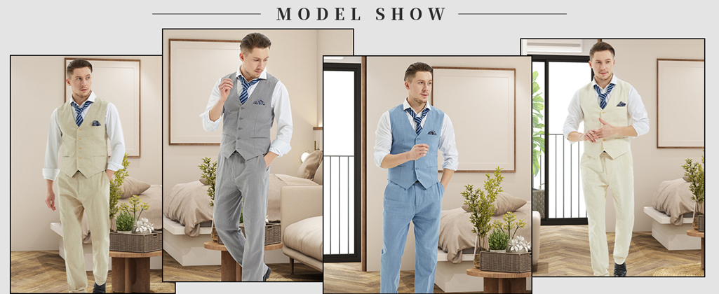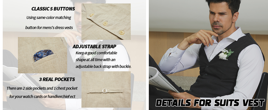 - FEATURE--Vest:Four Button,V-Neck,Smooth Back And Adjustable Back Tie,Slim Fit Style;Pants:Flat Front,Zippered Fly,Button End And Adjustable Waist Tab.
