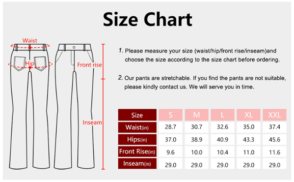TIPS before ORDER:Please refer to the size chart shown in the last picture to choose the specific size of pants. Feel free to contact us if you have any question, we’ll reply you in 24 hours.