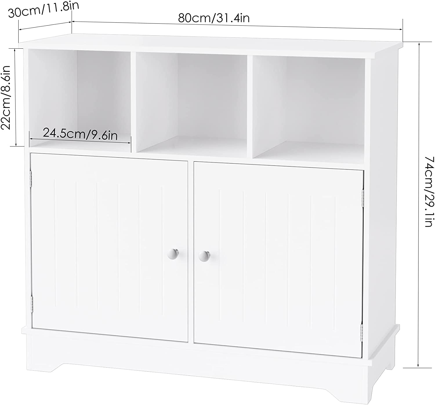 HORSTORS Floor Storage Cabinet, Linen Freestanding Bathroom Cabinet, Side Accent Cabinet with Doors and 3 Open Cubes for Home Office, 31.4" L x 11.8" D x 29.1" H, White