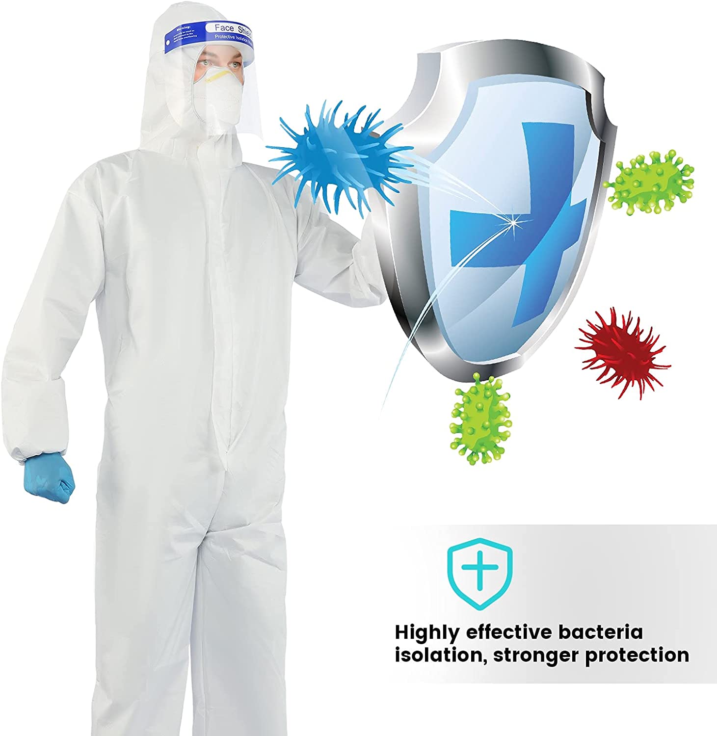 - 【Heavy-Duty Isolation Coverall with 360 Degree Protection】This one-piece white PPE coverall suit features an elastic hood, wrists, and ankles for a snug fit and reliable protection from liquid and particulate. The front zipper allows for easy on and off and the coverall provides full body coverage, shielding skin and clothing from dirt, dust, light liquid splashes, paint, and most mild chemicals and biological agents.
