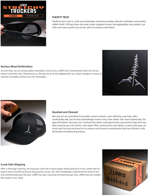 At Larix Gear we are serious about embroidery. Every Larix hat is embroidered right here at our shop in Columbia Falls Montana by us. It's our highest priority to achieve outstanding results by using the most advanced sewing technology and techniques available today. We have chosen Pacific Headwear 104c Richardson 112 and Yupoong 6606 models as our base trucker hats for the Larix designs. We believe these hats represent the best snapback mesh back adjustable retro trucker hats available anywhere. They are very similar to each other in quality fit shape and size. By using these models we can offer a better range of color options and in-stock availability. Not only are we committed to beautiful artwork clean stitching and crisp hats but we also painstakingly remove every visor sticker and more importantly the glue left behind. After removing the visor sticker as well as the glue we brush each hat and use forced air to remove any thread or contaminants that have hitched a ride during the manufacturing process. Then we wrap your Larix hat in tissue paper before placing it in our custom box to keep it clean and safe during its long journey to you. You will immediately understand the level of care and craftsmanship put into your Larix hat upon receiving and opening your box.