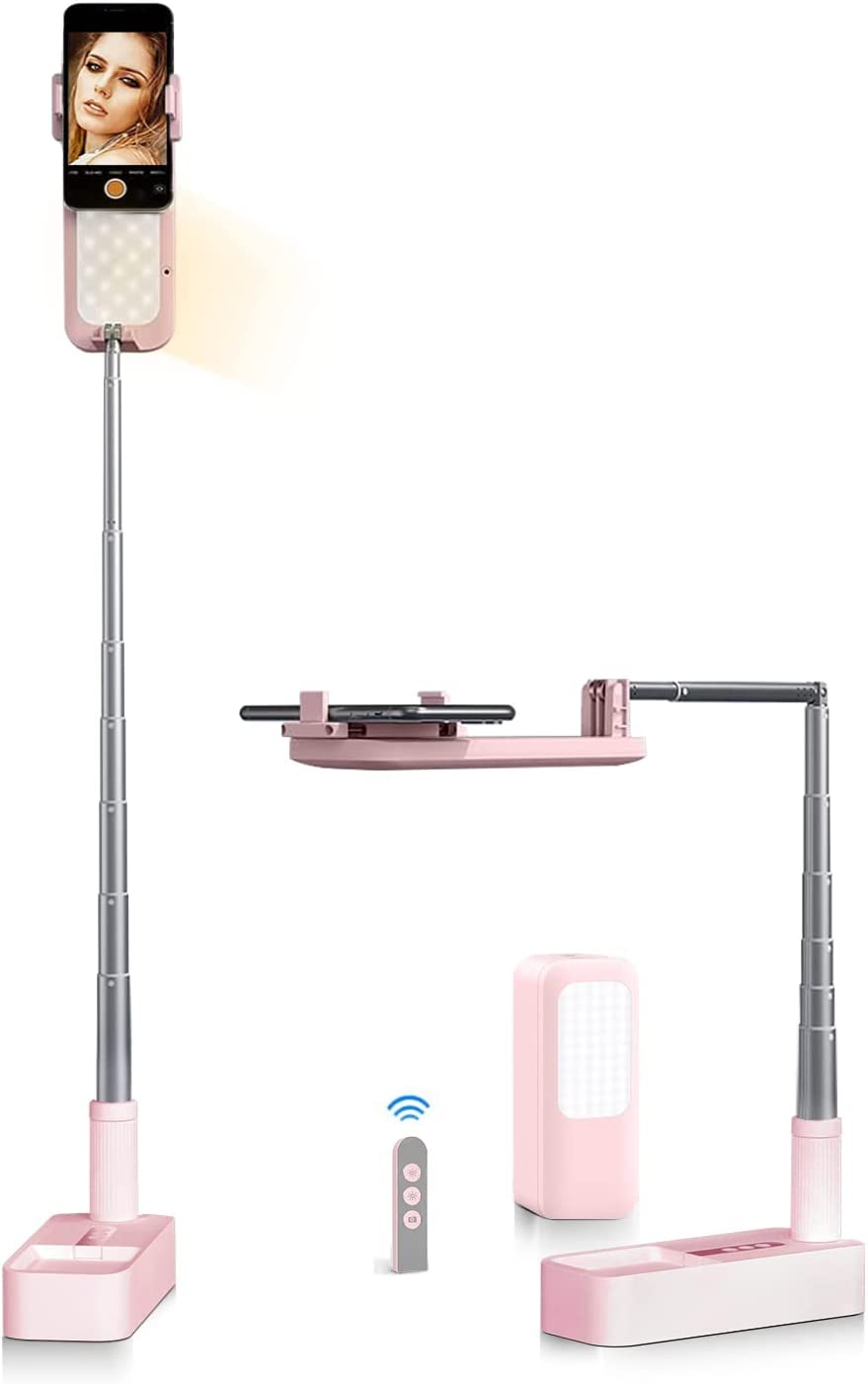 【Foldable Stand and Retractable Design】 This LED selfie holder has a one-piece foldable design, and its compact size makes it easy to carry anywhere. Can be used as a floor stand and expands to 49.2 inches. iPhone stand for video recording.