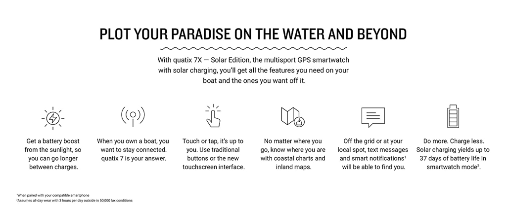 Plot your paradise on the water and beyond with quatix® 7X – Solar Edition, the multisport GPS smartwatch that has all the features you need on your boat and the ones you want off it, including solar charging. quatix 7X – Solar Edition provides comprehensive connectivity with compatible Garmin chartplotters and other compatible marine devices to offer autopilot control, data streaming, Fusion-Link™ entertainment system control, integrated tide data on the watch face, new alarms for better situational awareness and much more. Use traditional button controls or the new touchscreen interface to access selections. This smartwatch includes preloaded maps for thousands of golf courses and ski resorts worldwide and has preloaded TopoActive maps for outdoor adventures. When paired with your compatible smartphone, enjoy advanced smartwatch features for all-day wearability include built-in activity profiles for water and land sports, performance metrics, smart notifications, 24/7 health monitoring, access to the Garmin Connect™ app and Garmin Pay™ contactless payments (with a supported country and payment network)