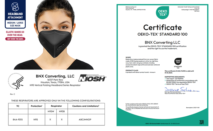 MADE IN USA* – Manufactured by BNX Converting LLC in Houston TX, a and Registered (Registration # 3017489417) manufacturer of N95 mask respirators. *Manufactured in the USA from globally sourced components.