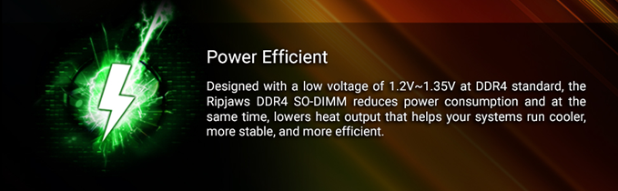 Requiring only 1.2V, the Ripjaws DDR4 SO-DIMM reduces power consumption and at the same time, lowers heat output that helps your systems run cooler, more stable, and more efficiently.