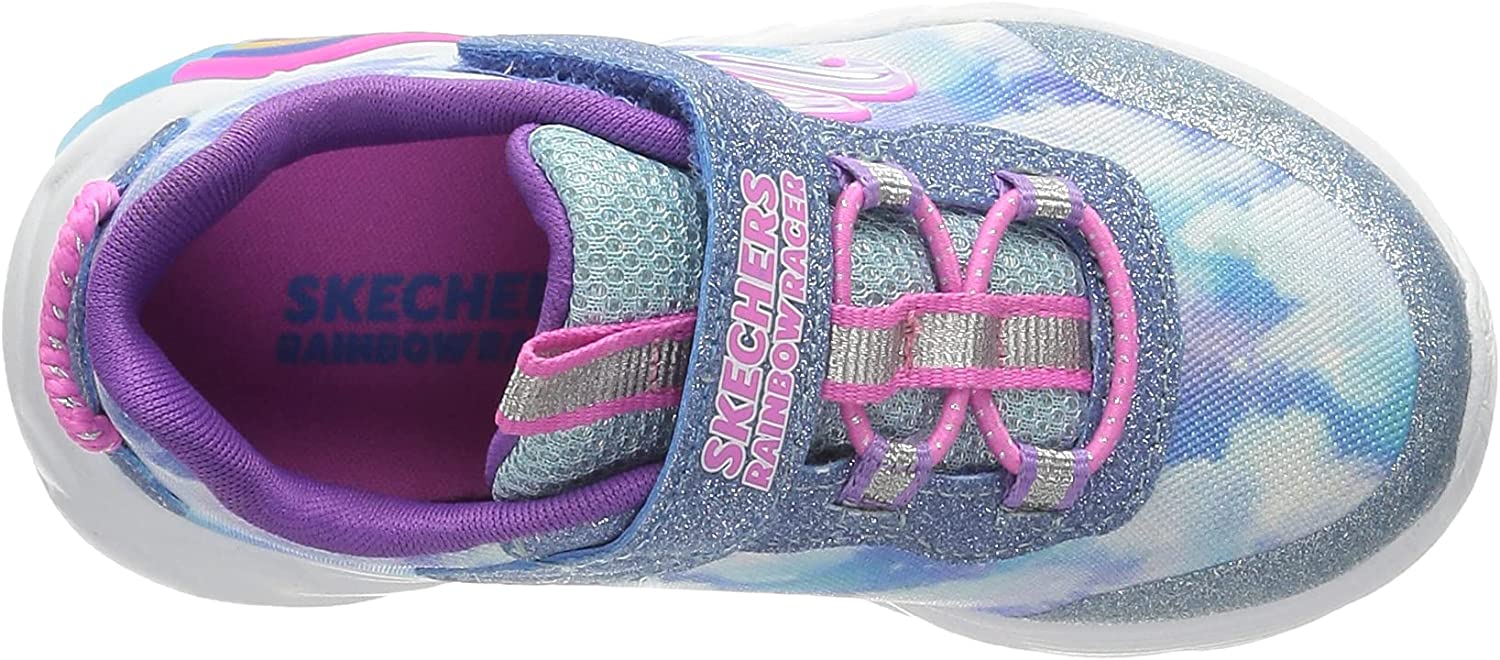 Brighten up the day in fun sporty style with the Skechers Rainbow Racer Lights(TM) shoe. This casual lightweight slip-on sneaker features a breathable athletic mesh and smooth synthetic upper with a fun rainbow cloud sculpted light-up midsole.