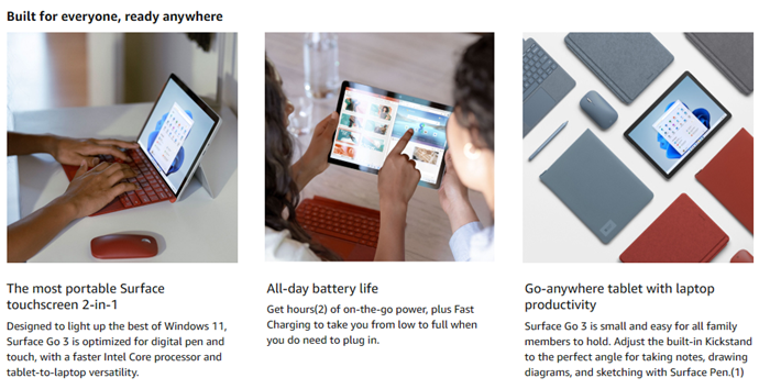 Ready, set, Go anywhere. The most portable Surface touchscreen 2-in-1 is perfect for your everyday tasks, homework, and play. Designed to light up the best of Windows 11, Surface Go 3 is optimized for digital pen and touch, with a choice of a faster Intel® Pentium® or Intel® Core™ i3 processor, plus all-day battery, tablet-to-laptop versatility, and comprehensive Microsoft security.
