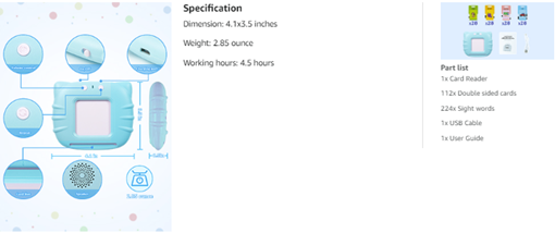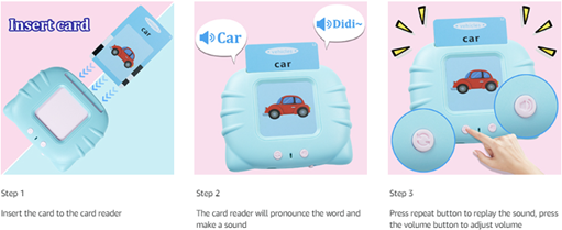 • [ Easy to Use ] - Put the card into the card reader’s slot, the card reader will pronounce the words. When an animal card or transport card is inserted the card reader will play real animal or transport’s sound. Press the repeat button to repeat the pronunciation and sound effect. This montessori toy keeps kids away from mobile phone and tablets, reduce screen time effectively.