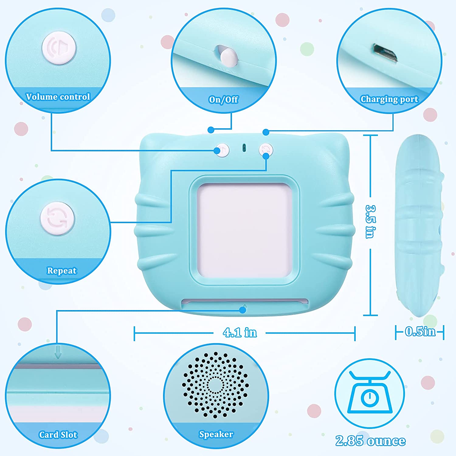 • [Rechargeable & Light ] - The toddler toy comes with built-in rechargeable battery and can be used for up to 4.5 hours, no need to charge frequently. The card reader weights 71g and dimension is 4*3.5*0.5inches, easy for kids to hold. Volume is adjustable. A portable bag is provided for easy storage of the cards and card reader
